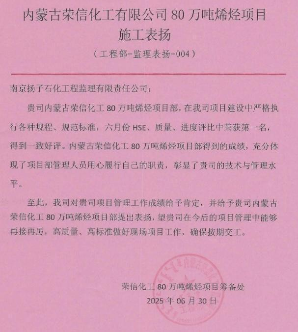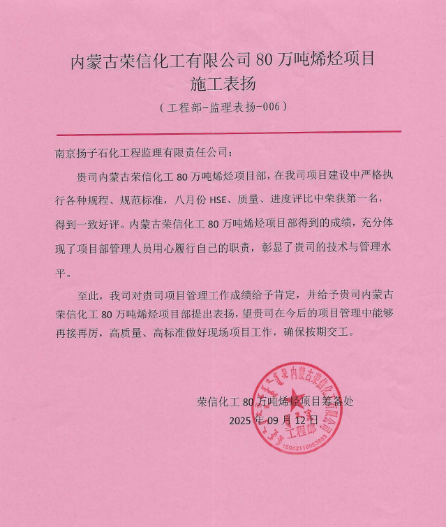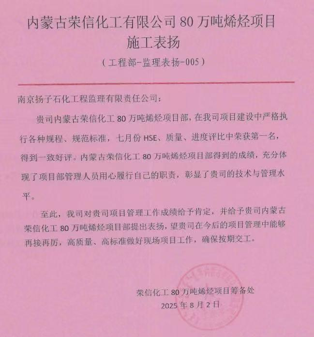 在国家现代煤化工产业示范区的建设热潮中,南京AG贵宾会石化工程监理有限责任公司在内蒙古荣信化工有限公司 80 万吨烯烃项目建设中展现出卓越的专业实力。AG贵宾会监理凭借在健康、安全与环境(HSE)管理、工程质量控制和施工进度保障等方面的突出表现,连续在 6、7、8 月份的月度评比中斩获第一名,成功蝉联优秀监理单位8月份流动红旗,为这一国家级煤化工重点项目注入了强劲的监理力量。